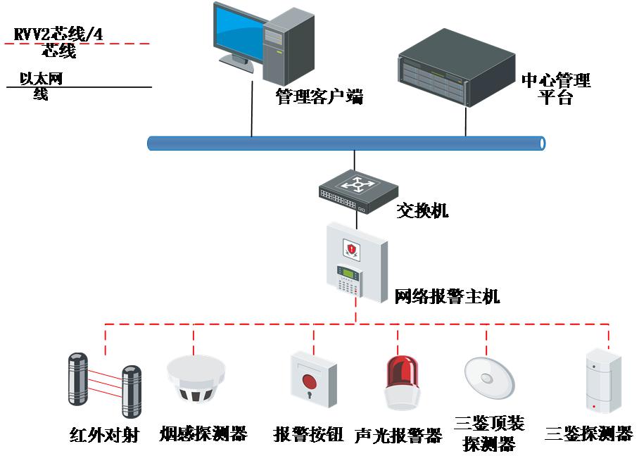 緊急報(bào)警按鈕、紅外雙鑒探測(cè)器、煙感探測(cè)器等前端報(bào)警采集設(shè)備通過RVV2芯/ RVV4芯線纜接入部署在機(jī)房的報(bào)警主機(jī)。